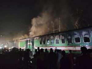 Four carriages of the Benapole Express that runs from Benapole, bordering West Bengal, were set on fire at around 9 pm on Friday at the Gopibagh area, less than two km from its destination of the capital’s Kamalapur Railway Station.