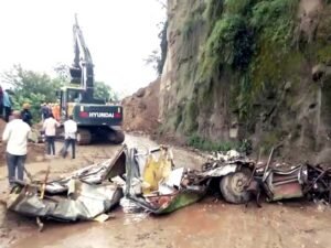 The incident occurred when the private bus, carrying passengers through the hilly stretch, was suddenly struck by falling debris following heavy rains in the region. Local administration, police, and State Disaster Response Force (SDRF) teams rushed to the spot to carry out rescue operations.