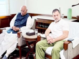 New Delhi : INDIA bloc leaders held a meeting on Monday to discuss the floor strategy for the second phase of the Budget Session of the Parliament.Leader of Opposition in Rajya Sabha, Mallikarjun Kharge and LoP in Lok Sabha Rahul Gandhi were present in the meeting along with Congress MPs Jairam Ramesh, KC Venugopal, Pramod Tiwari, NCP(SP) MP Supriya Sule, Shiv Sena (UBT) MP Sanjay Raut, CPI(MP) MP John Brittas and other alliance leaders.