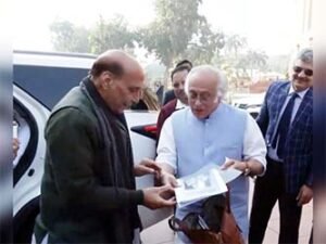 New Delhi : Congress MP Jairam Ramesh on Thursday handed over a set of pages from the book ‘Inside Story of Sardar Patel: The Diary of Maniben Patel’ to Defence Minister Rajnath Singh as he arrived in Parliament for the day’s proceedings.