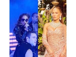 For the performance, Lopez chose a mix of stunning, bold outfits, including a black dress with cut-out designs and long boots, followed by a shimmery golden bodysuit paired with matching knee-high boots. Fans were equally delighted to see Jennifer Lopez performing live and with such high energy. At one point, JLo also raised a toast for the newlywed couple. Prior to her performance, Lopez added a touch of ethnic flair to her visit by wearing a beautiful saree for the wedding ceremony. With her signature charisma, the singer was dressed in an embellished saree in the shades of rose gold from the shelves of Manish Malhotra. She paired the outfit with a matching blouse and emerald jewellery from the same label. Over the weekend, JLo arrived in India for the star-studded wedding celebrations of Netra Mantena and Vamsi Gadiraju. Visuals of JLo greeting the Indian paps as she exited the airport have been circulating on the internet since she touched down in India.