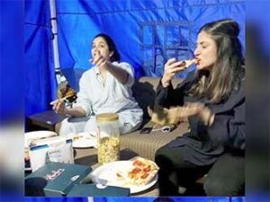 The pictures show Kareena and Rhea sitting together and indulging in pizza during what seems to be a casual hangout on a set-like setup with food boxes, plates and snacks placed on a table infront of them.