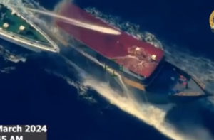 Another clip showed a white ship marked “China Coast Guard” crossing the bow of a grey vessel it identified as the Philippine supply boat Unaizah May 4, which was damaged in a China Coast Guard water cannon attack in the same area on March 5 that left four crew members injured.