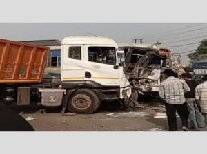 Khanna : A major road accident took place near McDonald’s on the National Highway in Khanna on Tuesday when a speeding truck-trailer lost control, jumped the divider, and crashed into a Punjab Roadways bus coming from the opposite direction.