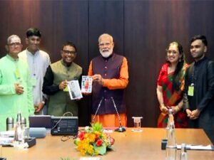 Chennai : In the midst of election campaigning in Tamil Nadu, Prime Minister Narendra Modi on Saturday met renowned music composer Ramesh Vinayakam and his family in Chennai, where he explored the Gamaka Box Notation System and participated in a musical session.