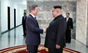 2018 – Historic Korean summit: the North’s Kim Jong-un and Moon Jae-in of South Korea agree to officially end Korean war and rid peninsula of nuclear weapons (pic credit-NK News).